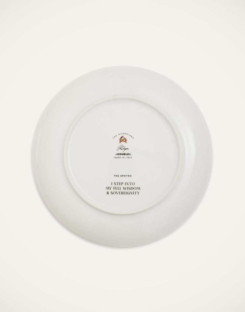 Fier, puissant et débordant d’inspiration mystique, le Sphinx est le plus mystérieux des Gardiens de cette collection. Souvent considéré comme le symbole de la muse, il se décline ici dans une couleur qui active les énergies avec des touches d’or 18 cts et est conçu pour allumer votre feu créatif et illuminer votre imagination. Que vous accrochiez cette superbe assiette Decorative sur le mur comme les Italiens, ou que vous la gardiez sur votre bureau pour y mettre vos petits bijoux créatifs, laissez le Sphinx vous guider vers une ambiance plus magnétique et magique. Fabriquée en collaboration avec l’artiste de Turin Elisa Seitzinger, la collection Guardian présente cinq gardiens naturels, protecteurs de l’énergie : la Licorne, le Sphinx, l’Ange, le Dragon, la Sirène. Avec des symboles cachés et complexes magnifiquement gravés, peints ou imprimés sur chaque pièce, il ne s’agit pas simplement de beaux objets : ce sont des générateurs de bonheur qui décuplent les vibrations, mettent du baume au cœur et distribuent de la positivité. Sélectionnez le gardien spécifique de la collection Guardian pour activer l’énergie souhaitée, ou collectionnez-les tous les cinq pour une conscience cosmique maximale. Si vous en éprouvez le besoin, n’hésitez pas à utiliser ce mantra avec votre objet Guardian : « Je me rends dans ma pleine sagesse et souveraineté